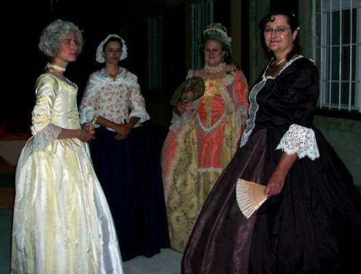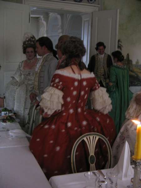 Another disappointment was the singer. Not musically - in that respect she was average. There had been test fittings and phone calls, Lilo had called back a pair of pocket hoops from a borrower, and I had dug out and brought some corsets and a robe to make sure she was dressed in style. But the singer refused to wear anything but the robe itself - although the corsets should have been relatively loose-fitting -, not even pocket hoops and a cap. Without the proper undergarments, the robe hung on her like a sack. The breakfast ladies refused period dress altogether, but since that was off-site, I didn't mind much.