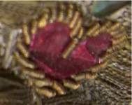 Typischerweise für flächige Musterelemente wie Blätter und Blütenblätter verwendet. Schneide aus einer Kopie der Musterzeichnung die Formen aus, die Du mit Kantille sticken willst, lege sie auf die Pappe, fahre sie nach und schneide sie dann aus Pappe aus. Schneide die Pappe etwas kleiner (ca. 1 mm auf allen Seiten) als das entsprechende Musterteil. Nun ist ja die Vorzeichnung, wenn Du sie per Bügelstift auf due Unterfütterung übertragen hast, auf der Unterseite, aber die Oberseite muß bestickt werden. Bei pappunterlegter Kantille ist es einfach: Meistens sind das längliche Blätter mit zwei Spitzen. Stich an jeder Spitze der Vorzeichnung eine Nadel von unten durch, dreh das Ganze um und klebe das Pappteil von oben so zwischen die beiden Nadeln, daß die Spitzen des Pappteils auf die Nadeln treffen. Paß nur auf, daß Du kein S-förmig geschnittenes Blatt dahin klebst, wo ein Z-förmiges hingehört. Kleine Abweichungen sind nur dann problematisch, wenn ein Kranz von Blütenblättern einen gemeinsamen Mittelpunkt haben muß, aber dann macht man halt in Gottes Namen zuerst den Mittelpunkt (z.B. in Form einer Folie) und gruppiert dann die ausgeschnittenen Blütenblätter von oben her frei darum herum, ohne sich um die Vorzeichnung zu bekümmern.
