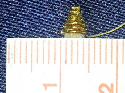 ... und vorsichtig bis zum Ende das Fadens schieben. Eine Kantille verhakt sich gern mal im Faden und wenn man dann trotzdem weiterschiebt, zieht sich die ganze Spirale auf und wird unbrauchbar. |