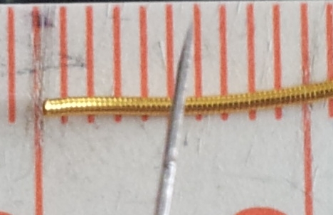 Zum befestigen der Stickerei braucht es Seidennähgarn (auch hier gilt wieder: Poly wäre pervers) in einem Farbton, der Gold bzw. Silber möglichst nahe kommt. Zum versticken von Kantille sind sehr, sehr dünne Nadeln mit winzigen Öhren nötig. Selbst die üblichen Perlennadeln sind für einige Kantillen zu dick: Ich besitze genau eine winzige Nadel, die durch meine kleinere Kantille paßt. (Ich wüßte nur zu gern, wo man Ersatz bekommt.) Das Einfädeln ist ein Graus. Dabei fällt mir ein, daß selbst für normalsichtige Leute eine Lupenbrille oder -lampe durchaus hilfreich sein kann.