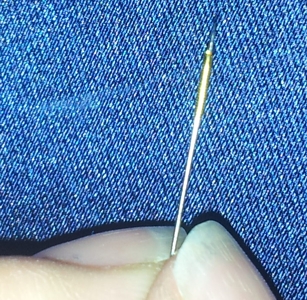 Nadel ein Loch, durch das man den Anfang des Vorlegfadens auf die Rückseite
